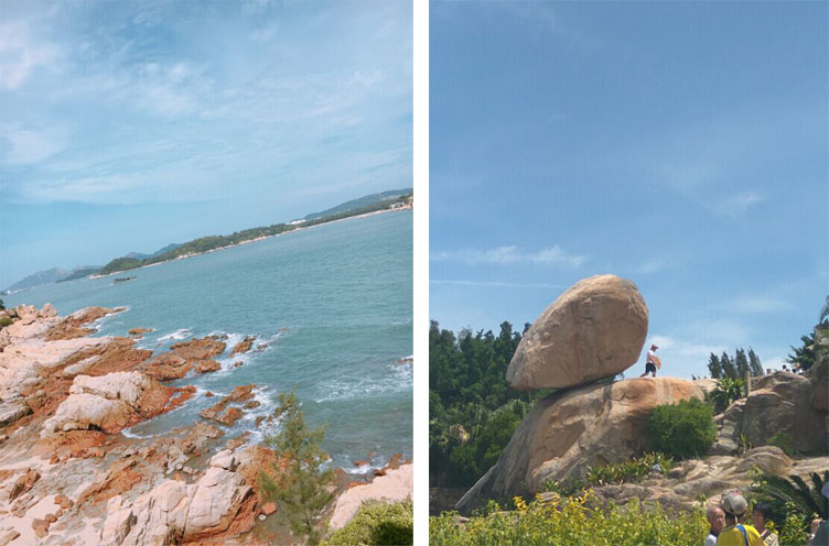東山島,別稱陵島,形似蝴蝶亦稱蝶島,風動石在關帝廟附近海濱石崖上,有一塊重約200噸的臨海巨石,狀似玉桃,底部觸地僅數(shù)寸,風吹石動,故名“風動石”,然而歷經(jīng)臺風、地震而不倒,有“天下第一奇石”之稱